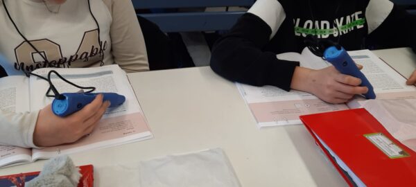 Um die Grundlagen in Deutsch zu trainieren, hat das Kultusministerium das neue Förderprogramm „Starke BASIS“ herausgegeben. Damit sollen die Kompetenzen der Schülerinnen und Schüler im Lesen und Schreiben gefestigt und verbessert werden. Unsere Fünftklässler sind gerade dabei, mit diesem Programm ihre Leseflüssigkeit und ihr Leseverständnis zu vertiefen. Dazu bekommt jeder ein Übungsheft mit verschiedenen Trainingseinheiten. Die Besonderheit dabei ist der Any-book-Stift. Drückt man diesen auf einen markierten Punkt im Heft und setzt Kopfhörer auf, wird der Übungstext vorgelesen. Auf diese Weise können die Schüler z. B. üben, wie der Text richtig betont und flüssig gelesen wird. Es gibt noch viele andere Leseübungen, zum Beispiel: Wie viele Wörter lese ich in einer Minute fehlerfrei? Auch verschiedene Aufgaben für Partnerarbeiten sind enthalten. Die Lehrerinnen werden in jede neue Lerneinheit im Rahmen einer Fortbildung eingeführt.