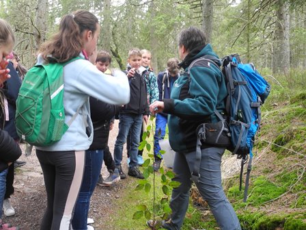 Im Geographieunterricht hatten sie zuvor einiges über die Entstehung und Bewirtschaftung des Schwarzwaldes erarbeitet. Nun sollten die Kinder im Rahmen dieses Ausflugs noch mehr über ihre Heimat erfahren. Aufmerksam hörten die Schülerinnen und Schüler der Mitarbeiterin des Infozentrums Kaltenbronn zu, die die Gruppe durch das Hochmoor führte. Sie lernten dabei den Unterschied zwischen einem Hoch- und einem Niedermoor kennen, erfuhren etwas darüber, wie typische Pflanzen im Moor überleben können und welche Tiere es gibt. Zum Schluss durften die Mutigen noch die Schlangenhaut einer Kreuzotter in die Hand nehmen.