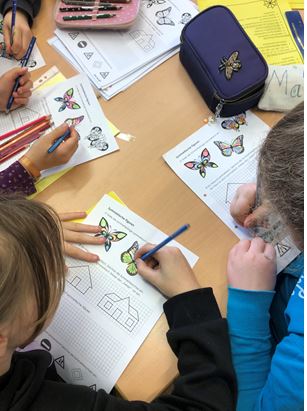 Einen ganzen Schultag lang nur Mathe lernen, ist das nicht sehr langweilig? Nicht bei unserem Mathetag! Am 26. Januar beschäftigten sich unsere Grundschüler einen Vormittag lang ausführlich mit einem Bereich aus der Geometrie, nämlich mit den Themen Spiegelungen und Symmetrie. Dazu hatten die Grundschullehrerinnen viele verschiedene und abwechslungsreiche Lernstationen in den Klassenzimmern vorbereitet. Nach einer gemeinsamen Einführung konnten die Kinder nun anhand eines Laufzettels auswählen, an welcher Station sie arbeiten und welche Aufgaben sie lösen wollten. Dabei gab es z.B. die Möglichkeit, Sterne oder Papierflieger zu falten und an einer Kommando-Bimberle-Station vertieften sie die Begriffe waagrecht, senkrecht und diagonal. Wer wollte, konnte Memory spielen, bei dem es darum ging, passende, spiegelverkehrte Hälften eines Sternes zu finden. Natürlich gab es viele Aufgaben, bei denen die Schülerinnen und Schüler selbst Spiegelungen mit unterschiedlichen Schwierigkeitsgraden durchführten. Beliebt waren die Aufgaben, die an den Tablets erledigt werden konnten.